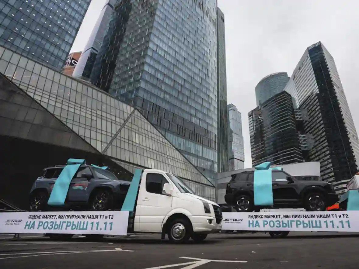 Во второй половине октября у одного из дилерских центров JETOUR в Москве появились несколько автомобилей, оформленных в красные чехлы, с предложением от Яндекс Маркета разыграть эти авто 11 ноября, в день Распродажи. Вызов был принят! Вскоре к офису Яндекс Маркета прибыли автовозы, на платформах которых стояли автомобили, украшенные нарядными подарочными лентами. Это были завоевавший огромную популярность на российском рынке кроссовер повышенной проходимости JETOUR T2 и дебютировавший в сентябре 2025 года кроссовер JETOUR T1.